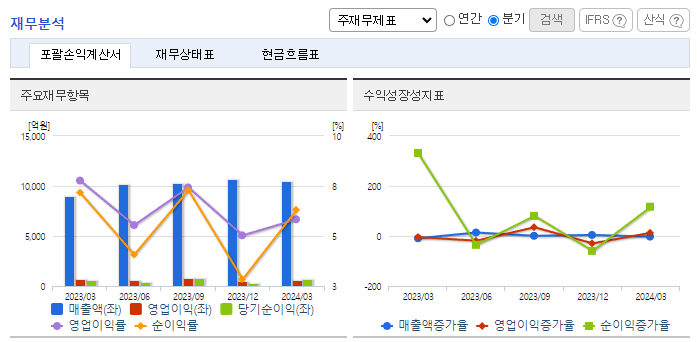 -2024년 3월 전년동기 대비 연결기준 매출액은 16.7% 증가, 영업이익은 12.3% 감소, 당기순이익은 18.3% 증가. 기계산업사업부에서 건설용 중장비 부품인 굴삭기의 CABIN 등을 HD현대인프라코어, 볼보그룹코리아 등에 납품하고 있음. 동사의 매출액은 전년동기 대비 다소 증가하였지만 주물, 몰드베이스와 같은 원재료 가격이 증가하고 각종 비용이 증가하여 영업이익은 감소함.