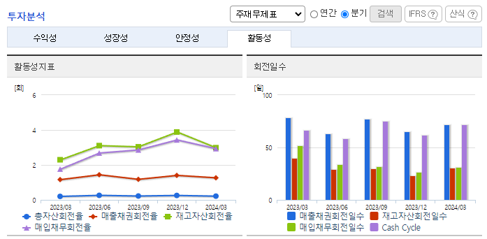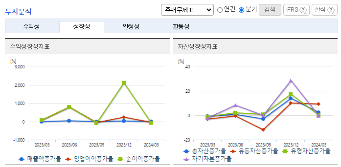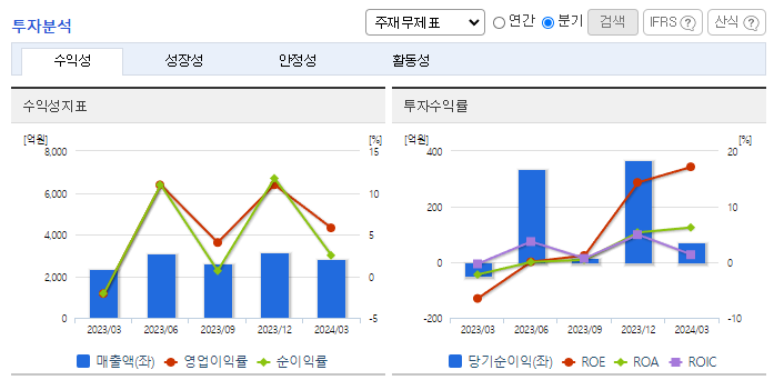 -2024년 3월 전년동기 대비 연결기준 매출액은 20% 증가, 영업이익 흑자전환, 당기순이익 흑자전환. 전사업부문 고른 성장을 보였으며 매출원가, 판관비 등 영업비용 관리를 통해 영업이익 흑자전환 성공함. 대형 신규 건설 현장의 부재로 인한 시황 저조 지속으로 실적 부진이 예상되지만 일부 호황 권역에 대한 영업 역량을 집중하여 외부 환경에 의한 타격을 극복하기 위해 노력 중.
