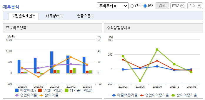 -2024년 3월 전년동기 대비 연결기준 매출액은 21.8% 증가, 영업이익은 114.7% 증가, 당기순이익은 97.4% 증가. 지난해 같은 기간 대비 데코필름의 매출이 크게 상승한 반면, 사출필름의 매출비중은 다소 감소하였음. 동사의 필름은 스마트기기의 부품을 조립하는 1차 협력사에 납품하는 구조이며, 최종 매출처는 삼성, 삼성디스플레이, LG디스플레이, Oppo로 구성됨.