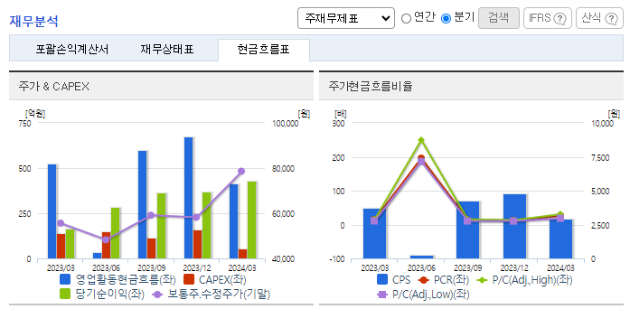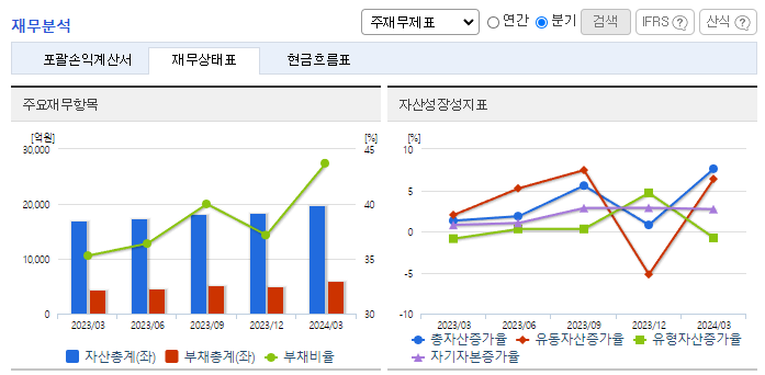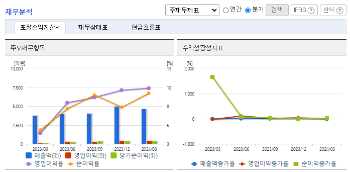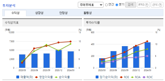 -2024년 3월 전년동기 대비 연결기준 매출액은 23.5% 증가, 영업이익은 211.5% 증가, 당기순이익은 163% 증가. 당분기 생산량은 전년동기대비 30% 증가한 570만 대이며, 차량용 축전지 관련 매출이 46.8% 증가함에 따라 전체 매출이 크게 증가함. 주요 원재료인 납 가격이 2023년 대비 2.8% 감소하였으며 전략적 판매 전략과 수익성 중심의 운영으로 매출 원가가 개선됨에 따라 수익성이 크게 증가함.
