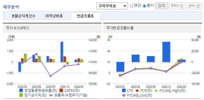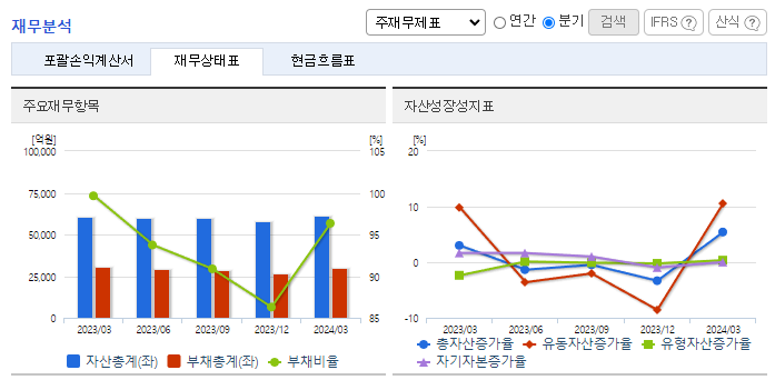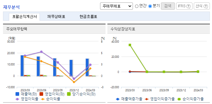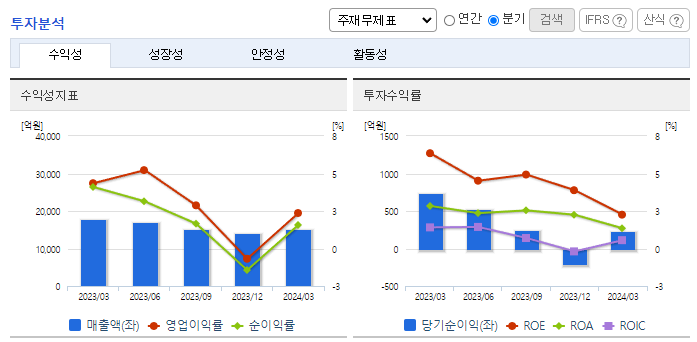 -2024년 3월 전년동기 대비 연결기준 매출액은 15.4% 감소, 영업이익은 54% 감소, 당기순이익은 65.4% 감소. 국내 철강업계가 자동차, 건설 등 전 방 수요 부진과 각종 통상 이슈로 어려움을 겪으면서 매출 및 이익률이 크게 감소하였음. EU, 미국, 영국 등 주요 국가에서 해외 철강재에 대해 무역장벽을 높이고 있음. 탄소배출량과 관련된 규제로 인하여 국내철강업계의 부진은 당분간 지속될 예정.