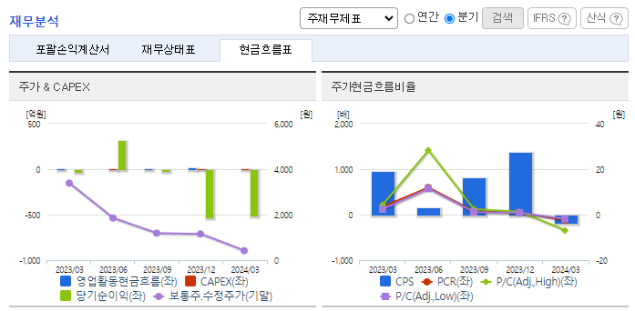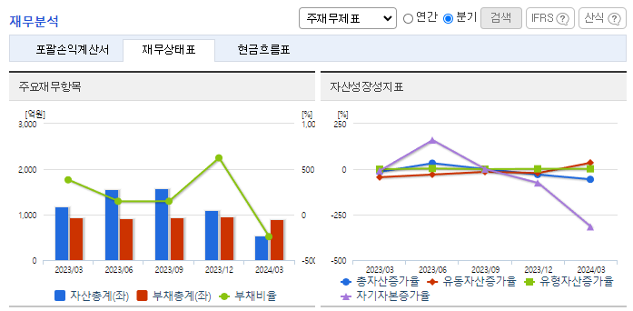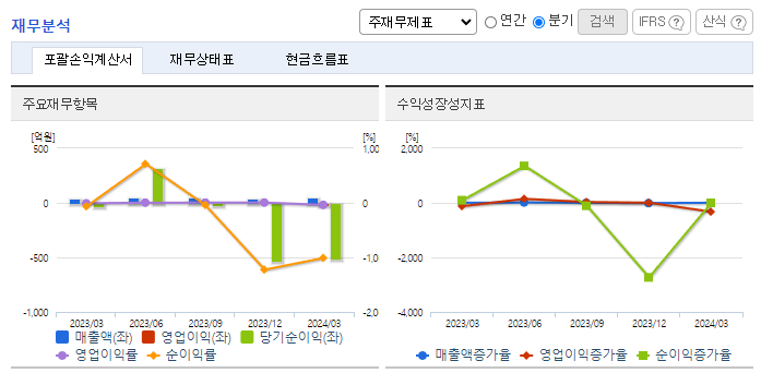-2024년 3월 전년동기 대비 연결기준 매출액은 28.08% 증가, 영업손실은 514.74% 증가, 당기순손실은 1,896.48% 증가. 매출원가 77.21%, 판관비 52.43% 증가하면서 매출액이 성장했음에도 불구하고 영업손실이 대폭 상승함. 동사 매출 구성 중 LapBag 사업 부문이 28.23%, 기타 사업 부문이 72.44% 증가하면서 전체 외형 성장을 이끎.