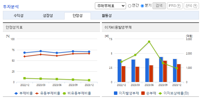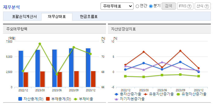-2023년 12월 전년동기 대비 별도기준 매출액은 0.7% 증가, 영업이익은 5.5% 감소, 당기순이익은 18.1% 감소. 간장용제 고덱스 포함 케미컬의약품이 2,068억 원의 매출을 달성하였으며 램시마 외 5종의 바이오시밀러 매출은 약 733억 원을 달성하였음. 동사는 청주공장 내 피하주사(SC) 제형 바이오의약품 생산을 위한 프리필드시린지(PFS) 생산라인을 갖추고 바이오의약품 생산 대응력을 겸비하고 있음.