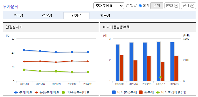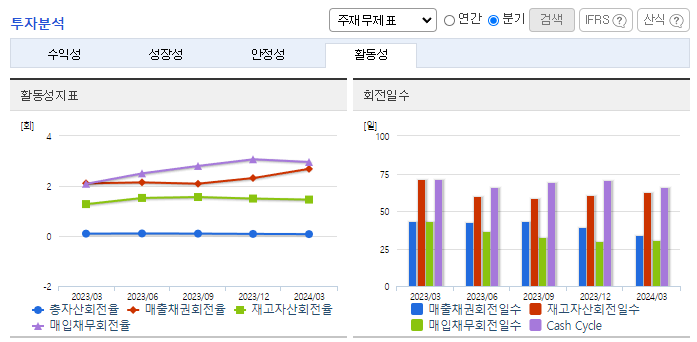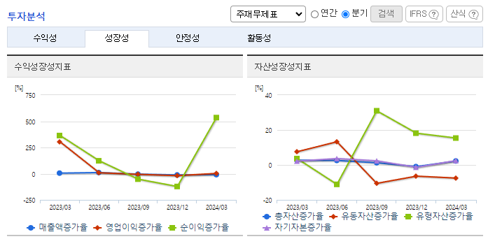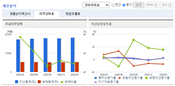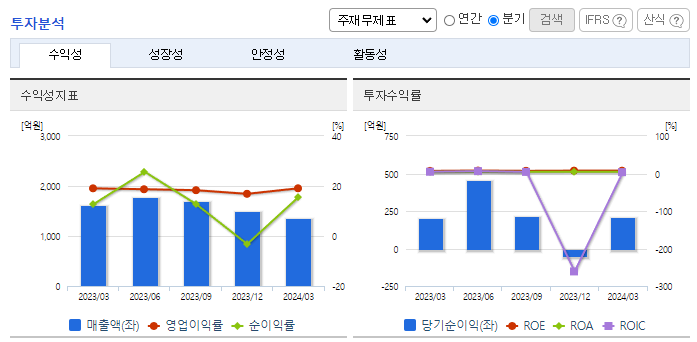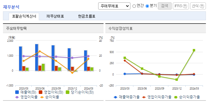 -2023년 12월 전년동기 대비 연결기준 매출액은 17.1% 증가, 영업이익은 64.6% 증가, 당기순이익은 41.8% 증가. 동사는 이러한 환경 속에서도 6,616억 원의 연결기준 매출을 기록했고, 이익 규모에 있어서는 전년 대비 상승한 1,210억 원의 영업이익을 기록함. 동사 주력제품의 경쟁 심화 및 급변하는 산업의 패러다임은 당사에 위협이 될 것으로 보이며, 이를 위해 동사는 철저히 준비 중임.