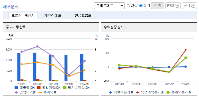 -2024년 3월 전년동기 대비 연결기준 매출액은 4.3% 감소, 영업이익은 34.4% 감소, 당기순이익은 37.3% 감소. 불안정한 글로벌 환경하에서 수요감소함에 따라 산업용 및 기능성 화학제품의 수출 부진한 모습. 매출 감소에 따른 원가율 상승 여파로 수익성은 보더 큰 폭으로 하락한 상황. 불확실성이 계속되고 있어 단기간 내 급격한 실적개선은 쉽지 않을 전망이나, 고객사의 재고 수준 확대 시 개선 가능할 것으로 기대.