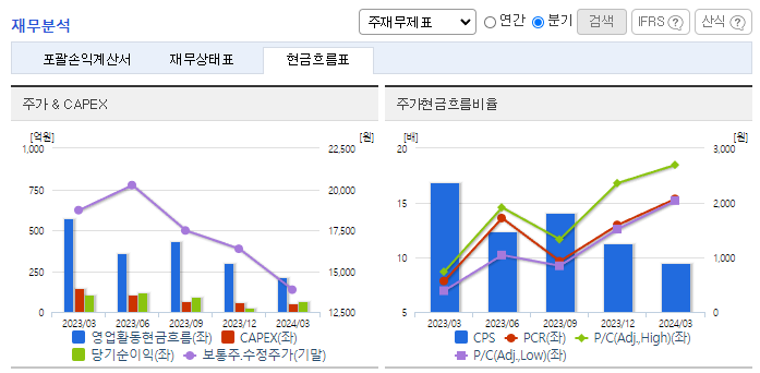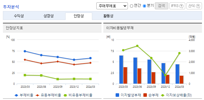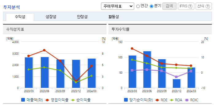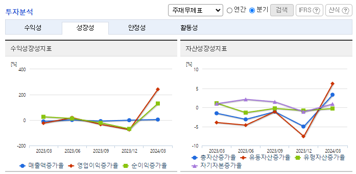 -2024년 3월 전년동기 대비 연결기준 매출액은 4.3% 감소, 영업이익은 34.4% 감소, 당기순이익은 37.3% 감소. 불안정한 글로벌 환경하에서 수요감소함에 따라 산업용 및 기능성 화학제품의 수출 부진한 모습. 매출 감소에 따른 원가율 상승 여파로 수익성은 보더 큰 폭으로 하락한 상황. 불확실성이 계속되고 있어 단기간 내 급격한 실적개선은 쉽지 않을 전망이나, 고객사의 재고 수준 확대 시 개선 가능할 것으로 기대.