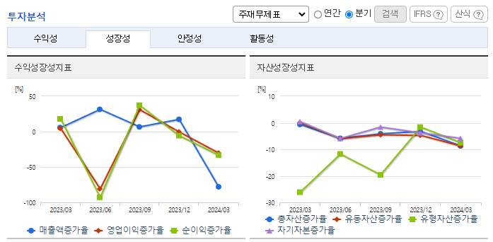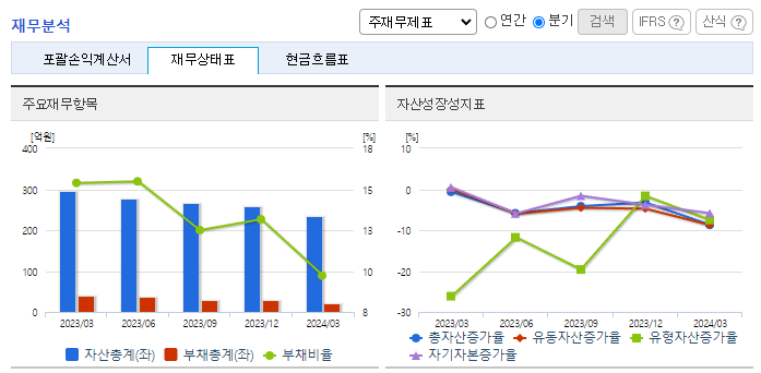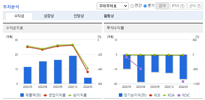 -2024년 3월 전년동기 대비 연결기준 매출액은 63.8% 감소, 영업손실은 63.1% 증가, 당기순손실은 70.5% 증가. 용역 프로젝트들이 본격적으로 진행됨에 따라 용역 매출의 인식으로 매출액은 증가하였으나, 신규 게임 개발에 따른 개발 인력충원 및 주식보상비용 등 내부 인건비 증가로 비용이 크게 증가하여 영업손실 지속. XR 워킹시스템의 국제표준 제정을 바탕으로 향후 교육훈련 사업의 해외 진출을 본격화할 예정임.