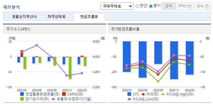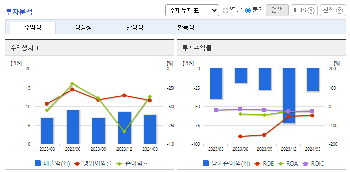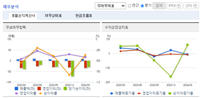 -2024년 3월 전년동기 대비 연결기준 매출액은 12% 증가, 영업손실은 1.3% 증가, 당기순손실은 25.3% 감소. CTC 기반 Liquid Biopsy 기술이 확대되면서 새로운 암진단 및 암케어를 위한 실수요자가 많이 발생될 것으로 예상. 미국과 일본에서 대학 병원과 UCLA, USC, NCCHE 등 유명 병원들을 대상으로 적극적으로 마케팅 활동을 진행 중이며, 최근 미국에서 CTC기술 세미나를 개최함.