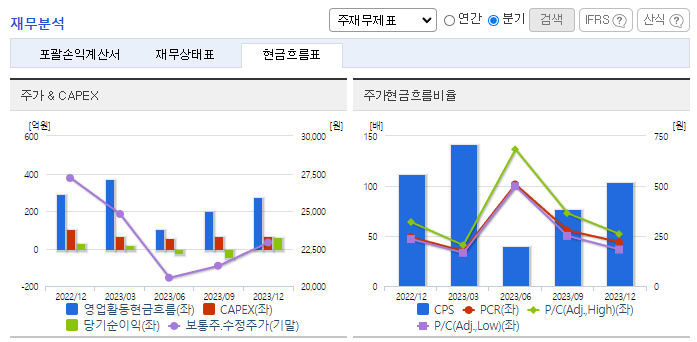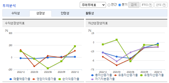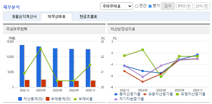 -2023년 12월 전년동기 대비 연결기준 매출액은 57% 감소, 영업이익 적자전환, 당기순이익은 99.6% 감소. 매출이 큰 폭으로 줄면서 판매비와 관리비 감소에도 불구하고 영업이익 역시 적자 전환했음. 재무비율 측면에서 자기 자본비율이 전년 대비 10% 포인트 증가한 82.7%, 부채비율이 전년 대비 17% 포인트 감소한 20.9%로 견조한 재무구조를 지속적으로 유지하고 있음.
