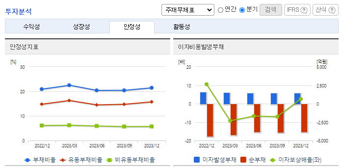-2023년 12월 전년동기 대비 연결기준 매출액은 57% 감소, 영업이익 적자전환, 당기순이익은 99.6% 감소. 매출이 큰 폭으로 줄면서 판매비와 관리비 감소에도 불구하고 영업이익 역시 적자 전환했음. 재무비율 측면에서 자기 자본비율이 전년 대비 10% 포인트 증가한 82.7%, 부채비율이 전년 대비 17% 포인트 감소한 20.9%로 견조한 재무구조를 지속적으로 유지하고 있음.