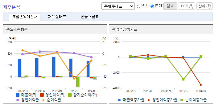 -2024년 3월 전년동기 대비 연결기준 매출액은 10.5% 감소, 영업손실은 306.4% 증가, 당기순이익 적자전환. 종속회사의 ceftiofur 매출이 급감한 영향으로 외형 축소된 모습이며, 이의 영향으로 영업손실 폭도 확대된 상황. 기존 공정 대비 높은 수율, 에너지 소비 및 폐기물 절감의 효과가 있는 친환경적 특수효소를 개발, 환경규제가 높아질수록 많이 이용되고 있는 점 긍정적으로 평가.