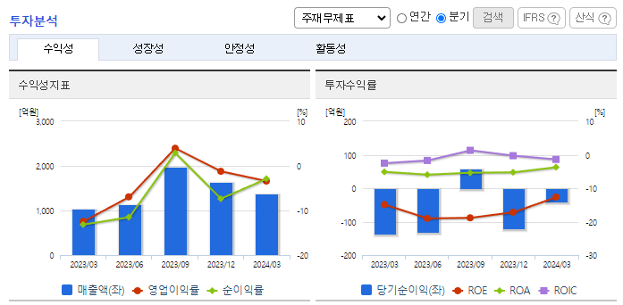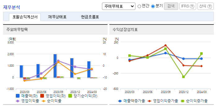 -2023년 12월 전년동기 대비 연결기준 매출액은 8.4% 감소, 영업손실은 7.9% 감소, 당기순손실은 54.6% 증가. 지속적으로 기존 북미 고객사에 소형 2차전지 보호회로 제품을 수주하였으나, 전방시장 경기 악화로 주요 고객사들의 신규제품 출하가 감소하여 매출이 역성장함. 전자담배 사업 매출액이 전기 대비 약 2배 증가하였으며, 2024년에도 신규 디바이스 진입을 추진 중임에 따라 전자담배 사업의 성장이 계속될 것으로 전망함.