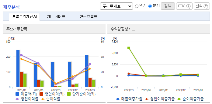 -2024년 3월 전년동기 대비 연결기준 매출액은 14.7% 감소, 영업이익은 38.9% 감소, 당기순이익은 44.7% 감소. 총 54개의 VC투자조합(VCF)에 누적 결성한 재원을 통해 선순환적 구조로 안정적인 매출이 발생하고 있으나 시장 침체와 비용 증가로 수익이 감소하였음. 2023년 12월 말 기준 미국 내 39개 업체에 대한 투자를 완료하였으며, 19개 업체가 나스닥에 상장되었음.