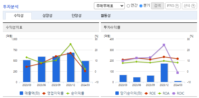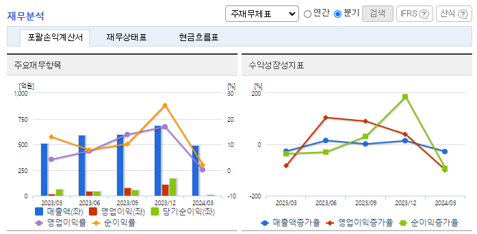-2023년 12월 전년동기 대비 연결기준 매출액은 4.9% 증가, 영업이익은 2.1% 감소, 당기순이익은 152.8% 증가. 당기순이익 증가 원인은 당기 중 일시적으로 발생한 금융상품 평가손익 때문임. 주 사업인 V3 제품군을 비롯해 보안 서비스 사업과 컨설팅까지 동사 제품 매출은 다양한 사업 분야에서 고르게 성장했고 동사 제품의 비중 확대를 통해 전체 매출액이 증가하고 수익성이 개선됨.