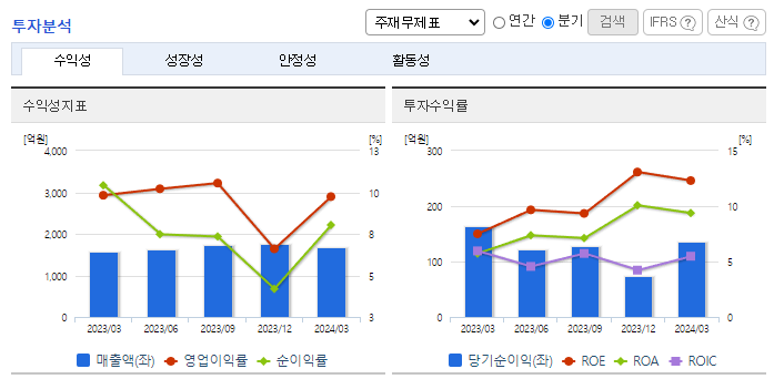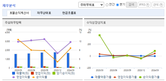-2024년 3월 전년동기 대비 연결기준 매출액은 7.7% 증가, 영업이익은 6.8% 증가, 당기순이익은 16.8% 감소. 중국과 일본, 베트남 등 글로벌 진출 확대가 실적을 견인함. 화장품 사업이 순항하며 전년동기 대비 늘어난 실적을 달성함. 지난 4월 국내 유통사와 손잡고 미국 화장품 시장 진출을 본격화함. 동사의 화장품 브랜드 ‘루나’는 지난 3월 진행된 큐텐 재팬의 대규모 할인행사 메가와리에서 최고 실적을 거두었음.