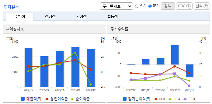 -2023년 12월 전년동기 대비 연결기준 매출액은 13% 증가, 영업이익은 24.7% 증가, 당기순이익은 9.1% 증가. 기존 및 신규 아티스트 앨범 출시에 따른 앨범 판매, 디지털 음원 매출 및 글로벌 콘서트 투어 등 사업의 호조로 매출과 영업이익이 동시 성장함. NCT 및 에스파, 엑소 등 기존 아티스트의 지속적인 글로벌 팬덤 확장과 막강한 음반 판매 파워를 앞세워 성장세를 이어갈 예정임.
