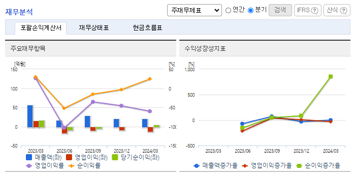 -2024년 3월 전년동기 대비 별도기준 매출액은 64.3% 감소, 영업이익 적자전환, 당기순이익은 70.1% 감소. 동사는 EHD 잉크젯 프린팅 설루션, EHD 코팅 솔루션 등 전체 사업부문에서 매출액이 전년동기 대비 감소하였고 매출원가 하락에도 인건비 상승으로 영업이익이 적자전환되었음. 현재 2차 전지 시장의 위축으로 고객사의 투자 결정이 지연되고 있는 상황이나, 향후 시장 상황 개선 시 매출에 기여할 수 있을 것으로 기대됨.