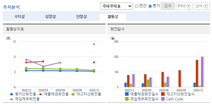 -2023년 12월 전년동기 대비 연결기준 매출액은 19.5% 증가, 영업이익 적자전환, 당기순이익 적자전환. 동사는 3 Q23 실적 콘퍼런스를 통해 실적 부진의 주요 원인이 NCM523 양극재에 사용되는 리튬가격의 예상치 못한 급락 때문이라고 밝힘. 경쟁력 확보를 위해 대구국가산업단지에 증설하는 등 시장 성장에 맞추어 글로벌 선도기업으로 발전해 나가기 위한 지속적인 노력 중.
