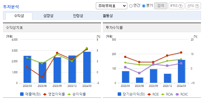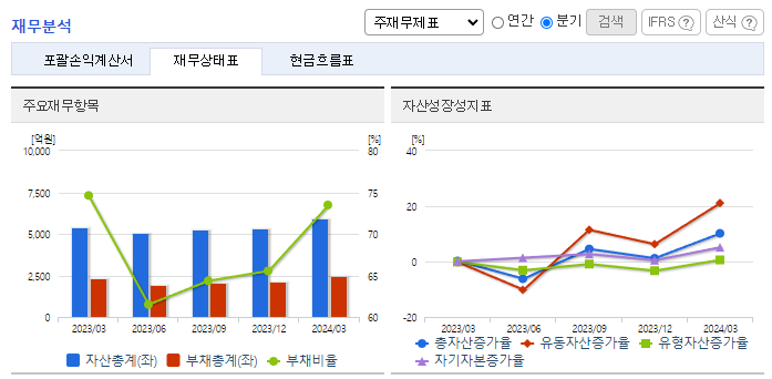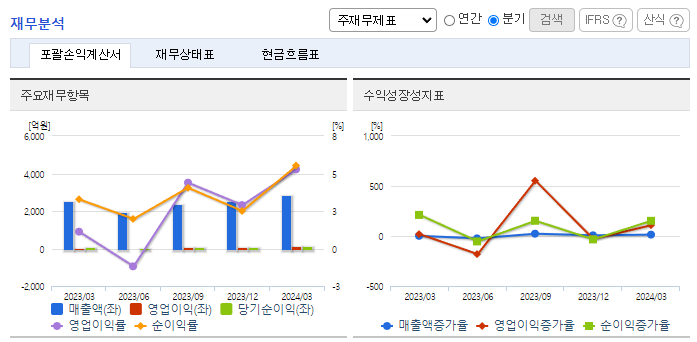 -2024년 3월 전년동기 대비 연결기준 매출액은 14.7% 증가, 영업이익은 440.3% 증가, 당기순이익은 93.7% 증가. 동사는 삼성전자 등에 프리미엄 스마트폰부터 보급형 스마트폰까지 라인업을 다양화하여 카메라 모듈을 공급하고 있고, 갤럭시 판매가 증가하며 동사 실적에 긍정적으로 작용됨. 고기능, 고화소, OIS, Actuator, 홍채인식모듈, 지문인식모듈, 멀티카메라 등 프리미엄 부품 개발에 노력.