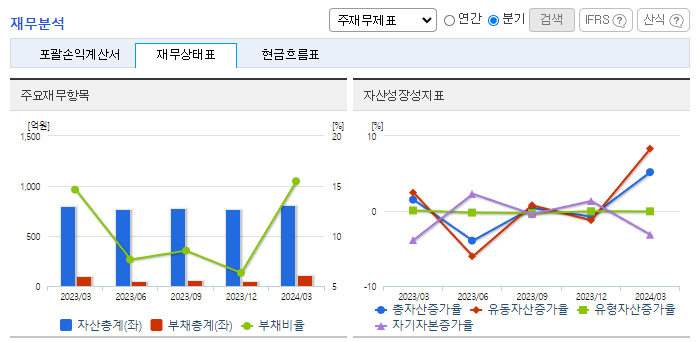-2024년 3월 전년동기 대비 별도기준 매출액은 17% 증가, 영업이익은 1.4% 감소, 당기순이익은 1.9% 감소. 전자부품의 원재료 가격이 상승하여 수익성이 감소하였으며, 판관비 및 연구개발비가 매출대비 상승하여 영업이익률이 감소함. 스마트팩토리솔루션 사업은 정부에서 추진하고 있는 '스마트공장 보급정책'에 필수적인 OT 및 IT적 확장성을 기반으로 성장성이 기대되는 사업임.