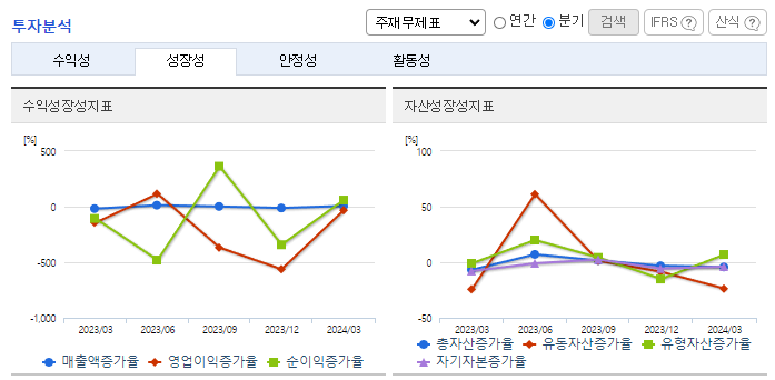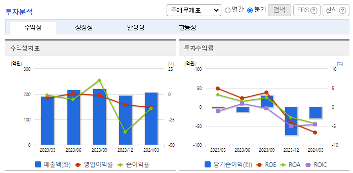 -2024년 3월 전년동기 대비 연결기준 매출액은 9% 증가, 영업손실은 274.3% 증가, 당기순손실은 1470.9% 증가. 동사의 2024년 1분기 매출액은 전년동기 대비 다소 증가하였지만 매출원가가 증가하고 운반비, 지급수수료 등과 같은 판관비 또한 증가하여 손실폭 또한 크게 증가하였음. 적극적인 영업전략 및 신모델 개발 등을 통해 시장 변화에 능동적으로 대처하여 수익성의 개선에 노력하고 있음.