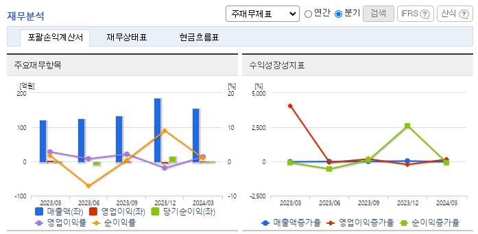 -올해 전체 반도체 업황이 개선되고 특히 HBM, CXL 관련한 부품 판매가 증가하면서 1분기 매출액이 26.9% 증가함. 영업익 감소는 신사업 투자 비용 증가가 반영된 것으로 추후 신규 매출이 본격적으로 발생하면 수익성이 개선될 것으로 기대됨. mmWAVE(밀리미터파) 케이블 제작 업체 인수와 전기 자동차 커넥터, DDR5 대응 소켓 양산 설비 등에 대한 투자를 진행하고 있음.
