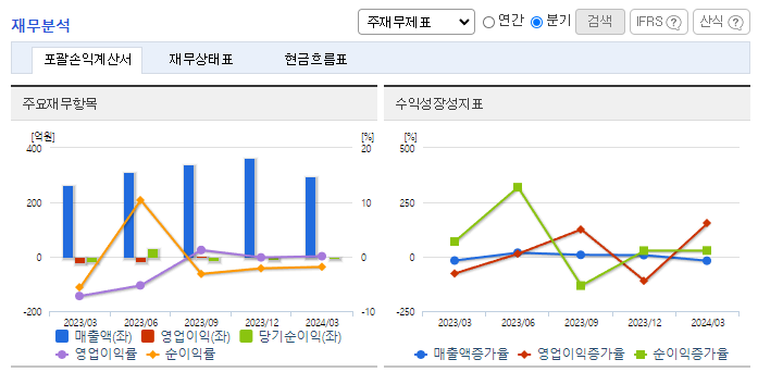-2024년 3월 전년동기 대비 연결기준 매출액은 12.4% 증가, 영업이익 흑자전환, 당기순손실은 56.6% 감소. 대부분의 사업 부문이 소폭 감소했지만 상품 사업 부문이 83.63% 증가하면서 전체 외형 성장을 이끎. 주요 매출원인 최종표면처리(금도금) 제품군은 현재 꾸준한 매출을 기록하고 있으나, PKG 분야에서는 End-user 미승인, 레퍼런스 부족 등을 이유로 아직까지는 매출이 발생하지 못하고 있음.