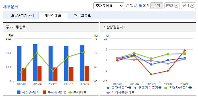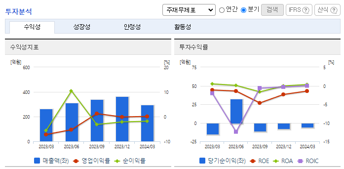-2024년 3월 전년동기 대비 연결기준 매출액은 12.4% 증가, 영업이익 흑자전환, 당기순손실은 56.6% 감소. 대부분의 사업 부문이 소폭 감소했지만 상품 사업 부문이 83.63% 증가하면서 전체 외형 성장을 이끎. 주요 매출원인 최종표면처리(금도금) 제품군은 현재 꾸준한 매출을 기록하고 있으나, PKG 분야에서는 End-user 미승인, 레퍼런스 부족 등을 이유로 아직까지는 매출이 발생하지 못하고 있음.