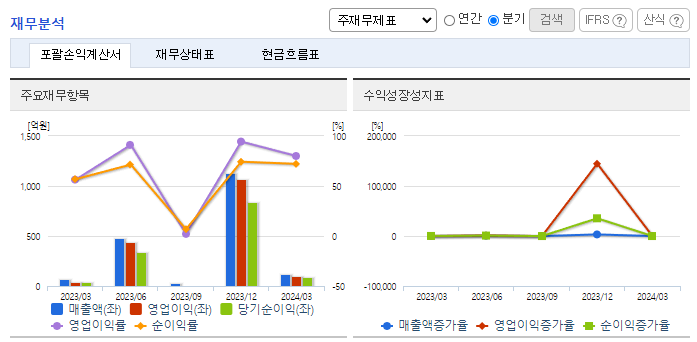 -2024년 3월 전년동기 대비 연결기준 매출액은 85.5% 증가, 영업이익은 163.4% 증가, 당기순이익은 135.3% 증가. 신기술수익의 증가로 인한 영업수익은 전년동기 대비 두 배이상의 증가세를 보였으며, 영업이익 또한 큰 폭의 성장세를 유지함. 지난해 설립한 미국현지법인 등을 통해 글로벌 투자 다변화와 회수시장 다각화 등을 통해 실적증대와 이익 확대를 위해 더욱 노력할 예정임.