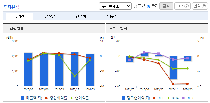 -2024년 3월 전년동기 대비 연결기준 매출액은 3.5% 감소, 영업손실은 45.6% 감소, 당기순손실은 17.9% 감소. 입체적 독서경험을 테마 도서에 적용한 '디즈니 인터랙티브 리딩' 시리즈 출시를 통해 시장의 큰 호응을 얻었음. 양질의 도서와 온·오프라인 학습 콘텐츠를 결합한 '웅진북클럽'과 AI 기술이 적용된 '웅진스마트올' 제품은 지속적인 개발을 통해 앞으로 스마트 시대의 교육시장 선도에 노력.