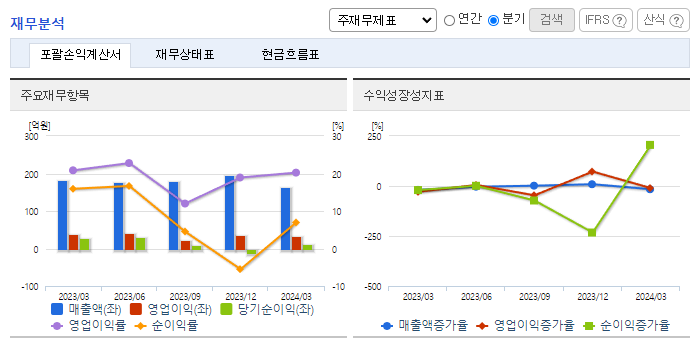 -2024년 3월 전년동기 대비 별도기준 매출액은 10.4% 감소, 영업이익은 13.1% 감소, 당기순이익은 61% 감소. 기업들의 투자가 지연이 지속되면서 지난 5분기 동안 전년동기 대비 매출이 역성장을 지속 중임. 다만, 절대적인 매출액의 감소에도 불구하고, 영업이익률 자체는 전분기 대비 상승함 정부지원금 중단에 따라 공공기관 및 중소기업 매출이 감소하였으나, 중견 및 대기업 매출이 증가하고 있음.