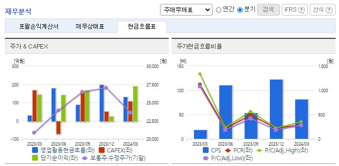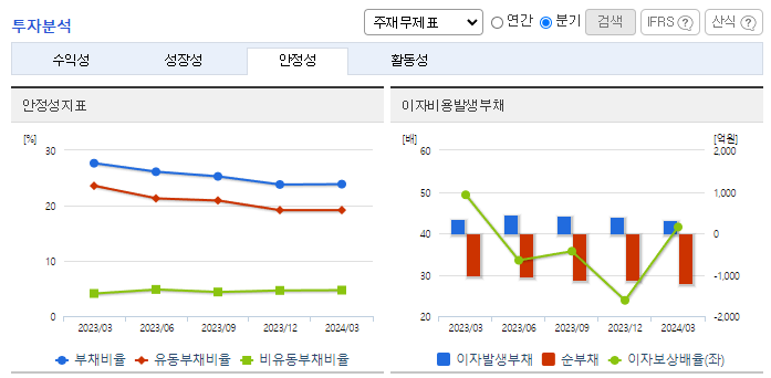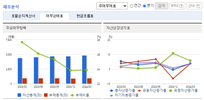 -2024년 3월 전년동기 대비 별도기준 매출액은 6.4% 증가, 영업이익은 35% 증가, 당기순이익은 32.7% 증가. 약 200여 개 제품을 생산하여 2024년 1분기 매출 732억 원을 달성하는 등 꾸준한 매출 성장과 함께 영업이익률 23% 수준을 유지하고 있음. 수출비중은 매출 대비 9%로 전 세계 40여 개국에 완제의약품을 수출하고 있음. 항혈전 치료제 '실로스탄 CR'이 매출비중 약 14%로 가장 높은 비율을 차지하고 있음.