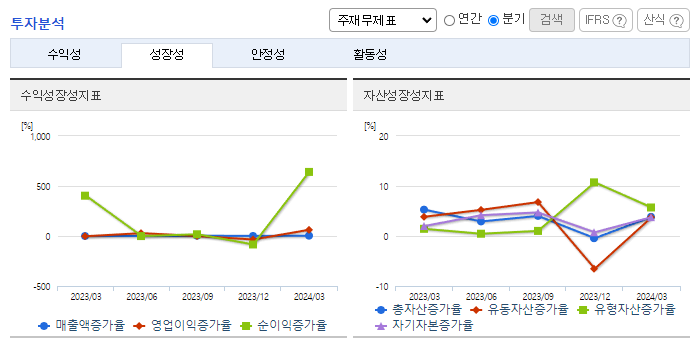 -2024년 3월 전년동기 대비 별도기준 매출액은 6.4% 증가, 영업이익은 35% 증가, 당기순이익은 32.7% 증가. 약 200여 개 제품을 생산하여 2024년 1분기 매출 732억 원을 달성하는 등 꾸준한 매출 성장과 함께 영업이익률 23% 수준을 유지하고 있음. 수출비중은 매출 대비 9%로 전 세계 40여 개국에 완제의약품을 수출하고 있음. 항혈전 치료제 '실로스탄 CR'이 매출비중 약 14%로 가장 높은 비율을 차지하고 있음.
