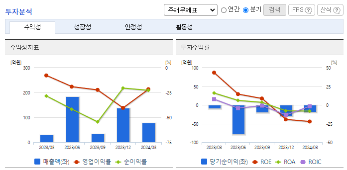 -2024년 3월 전년동기 대비 연결기준 매출액은 166.8% 증가, 영업손실은 633% 증가, 당기순손실은 113.3% 증가. 이차전지 자동화 조립장비 매출이 전년동기 대비 증가하였지만 금형, 집진기, Servo motor 등 원재료 가격 및 판관비 또한 증가하여 손실폭이 확대됨. 신규 사업으로 수소 연료전지 설비 시장에 본격적으로 진출하여 친환경 에너지 장비(전기차/ESS/수소연료전지/태양광 등) 선도기업으로 도약하고자 함.