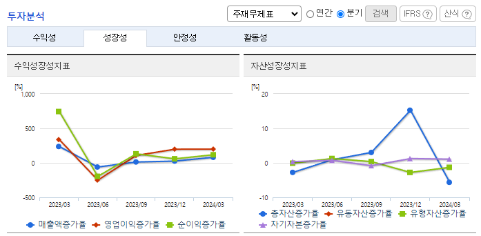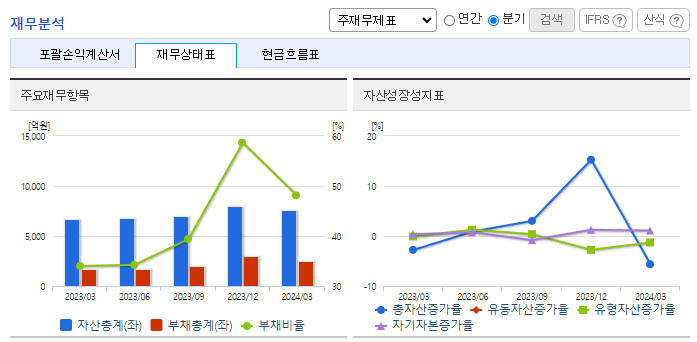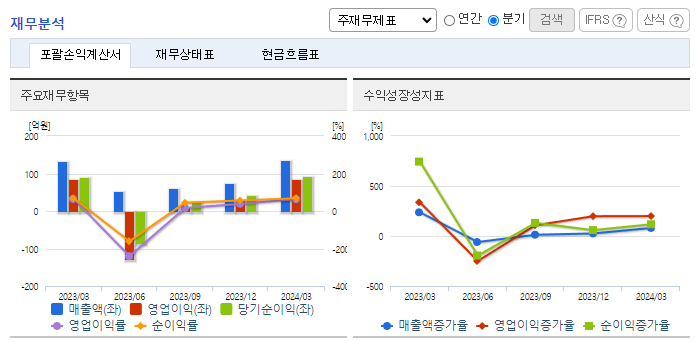 -2024년 1분기 별도기준 영업이익은 전년동기 대비 0.5% 증가, 당기순이익은 2.4% 증가함. 위탁매매를 주로 하는 리테일 부문은 영업적자를 지속함. 주식과, 채권 등에 투자하는 상품운용 부문은 이자수익은 늘었으나, 금융상품 평가이익은 줄어들어 이익이 감소함. 자산운용 부문과 기타 부문의 이익 증가로 1분기 영업이익과 당기순이익은 전년동기 대비 소폭 증가함. 순자본비율은 1,000% 넘는 높은 수준을 유지하고 있음.