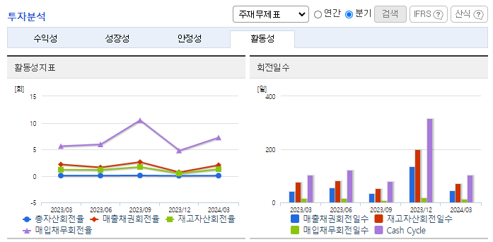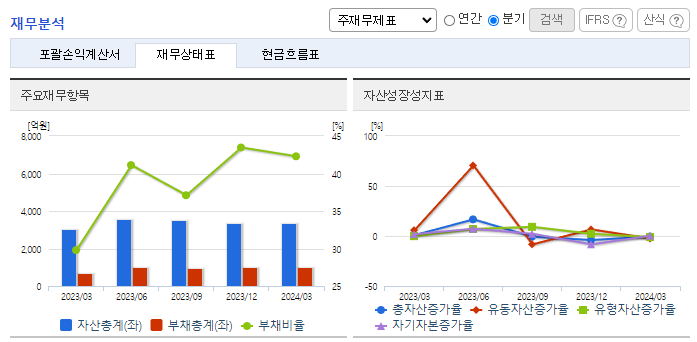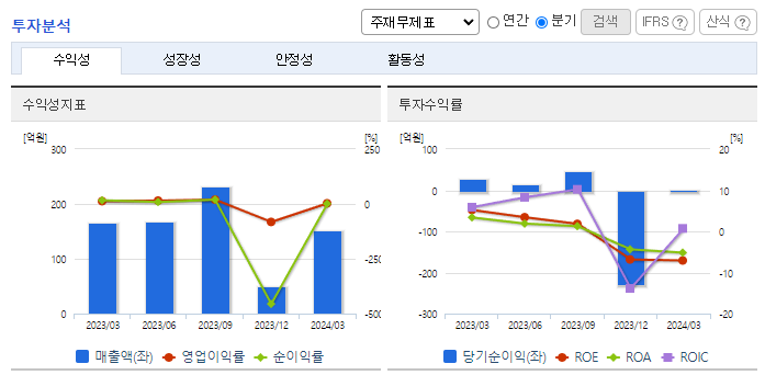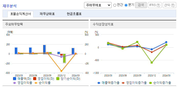 -2024년 3월 전년동기 대비 연결기준 매출액은 8.2% 감소, 영업이익은 78.5% 감소, 당기순이익은 39.4% 감소. 인플레이션에 따른 금리인상으로 하반기 글로벌 수요를 급속히 위축되면서 외형 축소. 극심한 원달러 환율의 변화와 원재료 비용 상승 등으로 영업이익 또한 악화됨. 동사 주요 목표시장은 전기자전거 중심의 스마트모빌리티 시장이며, (주)알톤을 중심으로 공공자전거 시장에서 점유율을 확대하는 것을 목표로 하고 있음.