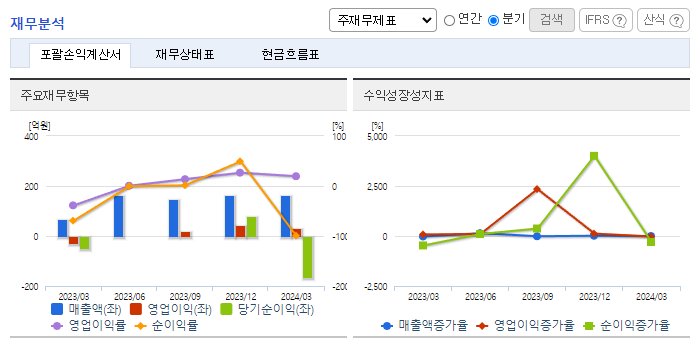 -2024년 3월 전년동기 대비 별도기준 매출액은 144.3% 증가, 영업이익 흑자전환, 당기순손실은 250.1% 증가. 주요 제품인 애브서틴, 파바갈, 클로티냅의 국내외 수요 증가가 지속됨에 따라 매출이 크게 성장하고 있음. 동사는 단백질 재조합 부문의 공정개발 노하우와 제품 출시 경험을 바탕으로 항암제, 희귀 난치성 분야의 바이오신약 개발을 목표로 지속적인 연구개발을 이어나갈 계획임.