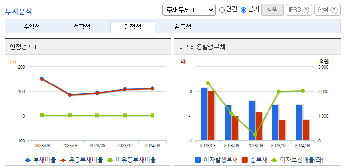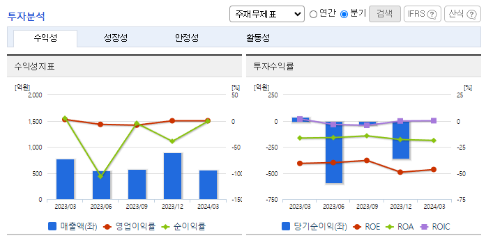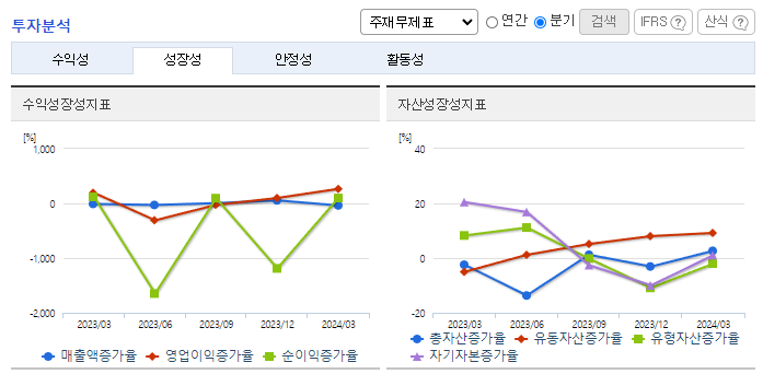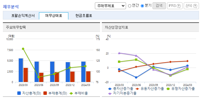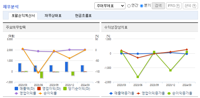 -2024년 3월 전년동기 대비 연결기준 매출액은 26.9% 감소, 영업이익은 97.2% 감소, 당기순이익 적자전환. 2024.03.21 2023년 사업연도 감사인의 감사보고서상 지배기업의 상장폐지 사유 발생, 종속기업 (주)이큐셀의 상장폐지 사유 발생을 이유로 감사의견거절을 공시하였음. 2024.04.12 동사는 상장폐지 이의신청서를 제출하여 2025.04.14까지 개선기간을 부여받았음.