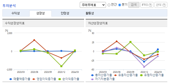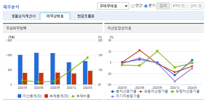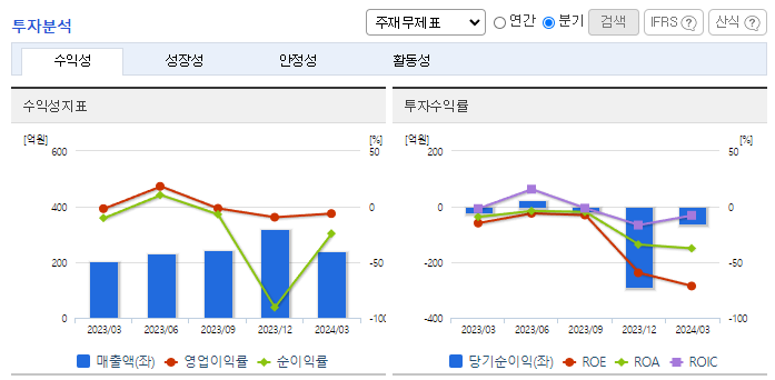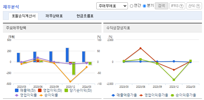 -2024년 3월 전년동기 대비 연결기준 매출액은 17.8% 증가, 영업손실은 299.7% 증가, 당기순손실은 180.9% 증가. 알뜰폰 가입자 수 증가 등 MVNO부문의 선전 영향으로 전년동기 대비 양호한 외형 기록하였으나, 원가율 상승 여파로 수익성은 악화된 모습을 시현하였음. 기대를 가졌던 스마트그리드부문의 경우 기대했던 것만큼의 성과를 나타내지 못하고 있는 점이 아쉬운 상황.