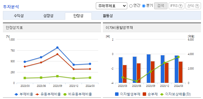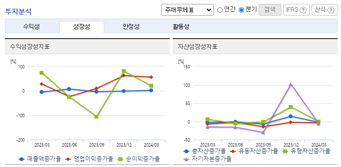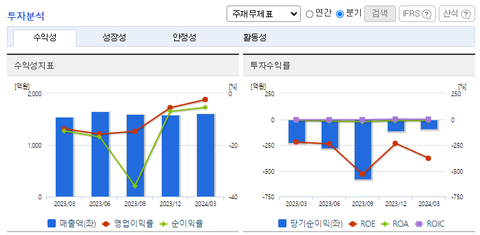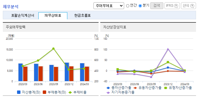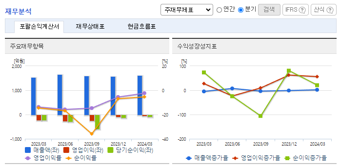 -2024년 3월 전년동기 대비 연결기준 매출액은 5.1% 증가, 영업손실은 82% 감소, 당기순손실은 50.7% 감소. 인건비가 8.3%, 수수료비용이 27.2% 감소하는 등 효율적인 비용관리를 통해 영업손실 폭을 감소시킴. 동사의 자회사 아이디언스에 동아에스티가 표적항암제 신약 개발을 위해 250억 원을 투자함에 따라 향후 자사 개발 약물의 경쟁력을 향상할 계획임.