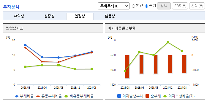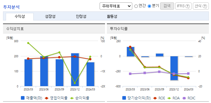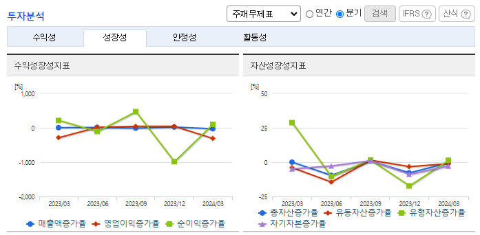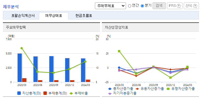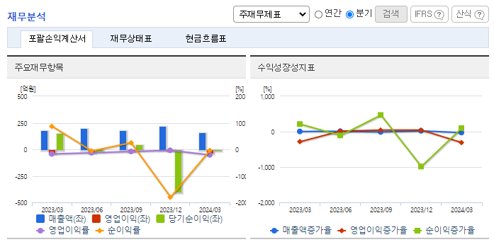 -2024년 3월 전년동기 대비 별도기준 매출액은 10.8% 감소, 영업손실은 13% 증가, 당기순손실은 86.9% 감소. 전사업부문에서 매출이 감소하였으며 수출에서는 47.7% 매출이 증가하였으나 내수에서는 14.0% 감소하였음. 노인인구가 늘어남에 따라 노인 대상 의약품 기반을 활용해 고령층 타깃 AI 디지털의료기기를 이용한 신사업 및 헬스케어사업 확장을 할 계획임.