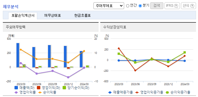 -2024년 3월 전년동기 대비 연결기준 매출액은 32.2% 감소, 영업이익 적자전환, 당기순이익은 22.2% 감소. 자회사인 일진하이솔루스의 수소사업부 인프라 확장 지연과 더불어 환경 사업부 보조금 예산 감소로 전년동기 대비 영업이익이 크게 감소함. 기존의 공업용 다이아몬드 사업에서 품질인증과 원가절감을 꾀하고 있으며 고온·고압 없이 다이아를 생산하는 기술을 개발하며 경쟁력을 확보해가고 있음.