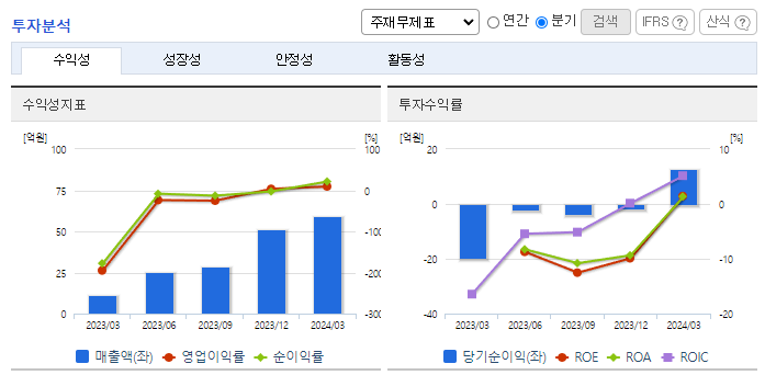 -2024년 3월 전년동기 대비 별도기준 매출액은 441.6% 증가, 영업이익 흑자전환, 당기순이익 흑자전환. 동사의 생산 제품은 크게 4가지임. 통신반도체(XGSPON칩) 및 XGSPON칩을 트랜시버와 결합한 XGSPON SFP+ ONU, 광트랜시버, 기가와이어, DVT 및 기타 SOC 등. XGSPON칩 및 관련 제품에 대한 매출이 개선되었고, 용역 제공 기간에 대한 수익이 발생하여 당분기 매출액 5,958백만 원을 달성하였음.
