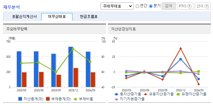 -2024년 3월 전년동기 대비 별도기준 매출액은 3% 증가, 영업이익 적자전환, 당기순이익 적자전환. 현재 대부분의 매출은 정부주도 사업인 방위사업/우주개발사업에 참여 내수 매출이며, 향후 해외시장 판로 개척으로 수출을 통한 매출을 기대하고 있음. AIRBUS와의 프로젝트를 통해 전자기파(EMP)에 대한 방호기술을 인정을 받았으며, 국내시장의 점유율을 높여가고 있음.