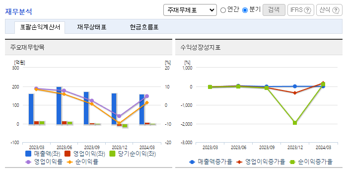 -2024년 3월 전년동기 대비 연결기준 매출액은 0.6% 감소, 영업이익은 46.8% 감소, 당기순이익은 85.4% 감소. 매출원가는 6.2% 감소했지만 판관비가 27.8% 증가하면서 영업이익에 악영향을 줌. 중국의 소득 수준 향상 및 신생아 수 증가에 따른 수출물량 확대를 기대하고 있음. 유럽 시장에서는 POE를 자체 제조하지 않는 제관사를 공략하고 있으며, 그 결과 최근 공급량이 확대되고 있음.