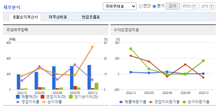 -2023년 12월 전년동기 대비 별도기준 매출액은 69.2% 증가, 영업이익 흑자전환, 당기순이익 흑자전환. 탄소나노튜브의 매출증가 및 원가절감 등의 영향으로 수익성이 개선되어 2023년도 영업이익율 10.5%, 순이익률 15.2%로 전년대비 각각 흑자전환 하였음. 이차전지산업의 수요에 맞춰 '24년 말까지 제2공장을 통해 2천 톤 규모의 CAPA를 추가 확보할 계획이며, 이를 통하여 총 3천 톤 규모로 CAPA를 확보할 예정임.