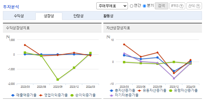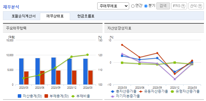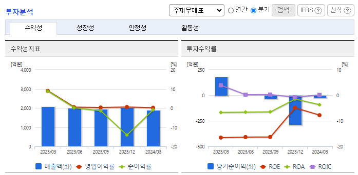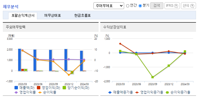 -2024년 3월 전년동기 대비 연결기준 매출액은 8.8% 감소, 영업이익은 98.6% 감소, 당기순이익은 99.6% 감소. 매출이 감소하였음에도 매출원가율이 증가하였고, 판관비가 증가함에 따라 영업이익 크게 감소함. 주요 종속회사인 제일약품의 1분기 매출 및 영업이익이 모두 감소하였지만 4월 식약처로부터 허가받은 P-CAB(칼륨 경쟁적 위산분비 억제제) 신약 '자큐보'를 통하여 매출 회복에 힘쓸 예정임.