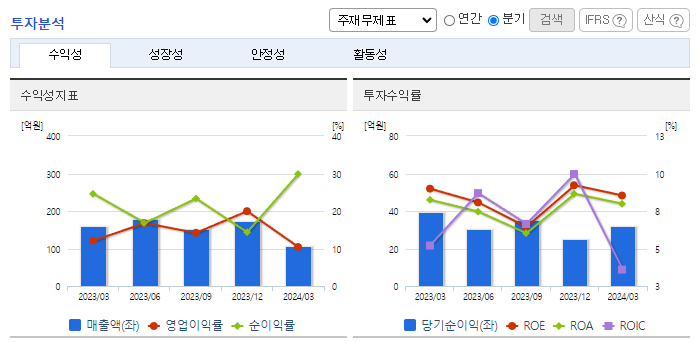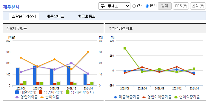 -2024년 3월 전년동기 대비 별도기준 매출액은 33.8% 감소, 영업이익은 43.2% 감소, 당기순이익은 19.5% 감소. 국내 피복아크용접봉 제조기술은 동사를 필두로 이미 세계적 수준에 올라와 있으며, 현재 중국 등 신흥국가들은 가격 경쟁력으로 도전하고 있으나 국내 기술 수준에 못 미치고 있음. 철 구조물, 기계, 플랜트, 자동차 등의 산업경기 밀접하며, 외부적 요인으로는 원자재 가격의 등락에 따라 수익성이 반영되는 산업임.