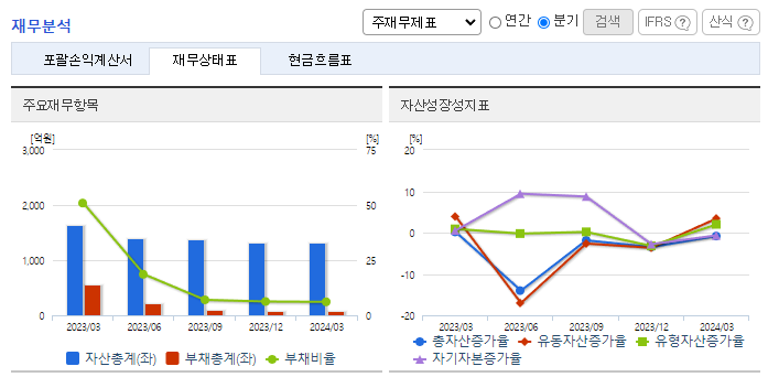 -2024년 3월 전년동기 대비 연결기준 매출액은 75.5% 감소, 영업손실은 6.5% 증가, 당기순손실은 16.2% 감소. 영업 외 손익에서 이자비용 감소로 인한 금융비용이 93.65% 감소해 당기순손실에 긍정적인 영향을 줌. 현재 바이오마커들을 이용한 암 조기진단 제품인 EarlyTect 제품군 개발을 완료 또는 업그레이드를 진행하고 있으며, 이중 대장암 조기진단 제품은 상용화 중임.