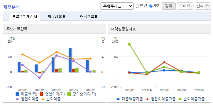 -2024년 3월 전년동기 대비 별도기준 매출액은 23% 증가, 영업이익은 98.2% 감소, 당기순이익은 6.9% 감소. 동사는 각 디스플레이 종류의 공정 변화에 대응하며 제품 공급망을 확대하고 있으며, 주요 매출처로는 국내 대표 디스플레이 회사인 삼성 디스플레이 장비 제작사 세메스임. 납품 후 각 Site에 동사의 C/S인원을 파견하여 Set-up 및 시운전 대응까지 진행하여 차후 새로운 매출 수요를 창출하고 있음.